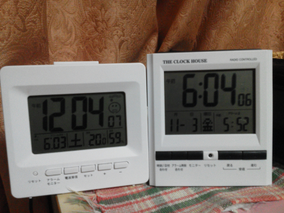 何日かして朝見たら、二つの時計の時間と日付が違う(笑)