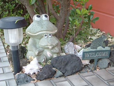 玄関にひょうきんな顔でどんと座っていたカエルさんです。