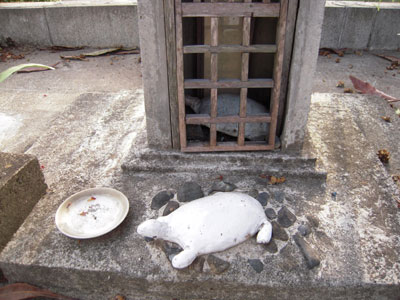 お友達から頂いた写真です。 道ばたの可愛いお社で、中にいるのが元々の白亀様で、手前がお友達の親戚のお祖父さんが作って奉納した白亀さんだそうです。昔、この辺りが洪水(確かに裏手は大川)が起こりそうになった時、白い亀が現れて村人を救った・・とか。 ぷ、ぷりてぃ・・・たまらん!