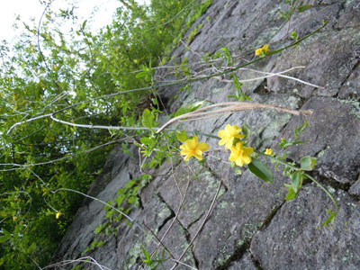 茎は根元から多数分枝し、上部で垂れ下がるので斜面への植栽が適している。若い茎は緑色で断面は四角形。低い稜があり太くなるにつれて断面は円形になる。葉は対生で3小葉からなり、頂小葉は5cm前後。3月から4月にかけ、直径4cm前後の黄色い花を咲かせる。花はオウバイに似ているが、常緑であることもあってオウバイほどは目立たない。花冠は6~8つに分かれるが、花の中心から旗弁がでるものもある。中心には1本の雌しべと2本の雄しべがあるが、種子は稔らない。