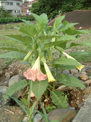 夏から秋まで、芳香のあるラッパ形の大きい花を下向きに咲かせる。 この植物の花、葉、茎、根、種など全てに毒の成分があるそうです。触ったら、手洗い必須!