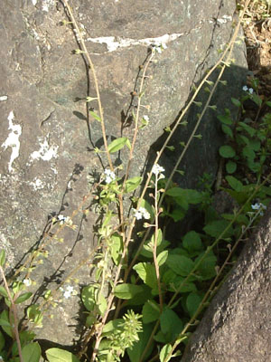 ムラサキ科/越年草 和名は葉をもむとキュウリのような匂いがすることに由来する。秋に芽生え、ロゼット状に葉を広げて冬を越す。3月頃から小さくて可憐な花を咲かせはじめ、次第に立ち上がって背丈が高くなる。5月頃には高さ30cmほどになることもある。花序はゼンマイ状に巻き込んでおり、しだいに伸びて長くなる。