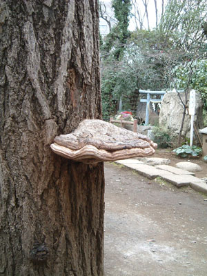 無柄で傘が棚状になるキノコの総称。「猿の腰掛け」の名の通り樹木の幹に半月状の傘を付けるものが多いが、背着生のもの、ふつうに傘が開くものもある。肉質は硬質のものが多い。 本当にちょこんと座れそうな高さにありました。 実際に目で見たのは初めてだったので、ちょっと感動しました。