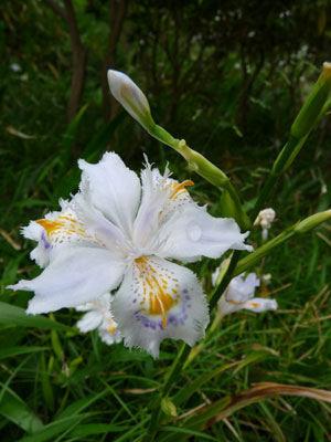 アヤメ科/多年草/原産:中国 根茎は短く横に這い、群落を形成する。草丈は高さは50~60cmくらいまでになり、葉はつやのある緑色、左右から扁平になっている。開花期は4-5月くらいで、白っぽい紫のアヤメに似た花をつける。花弁に濃い紫と黄色の模様がある。