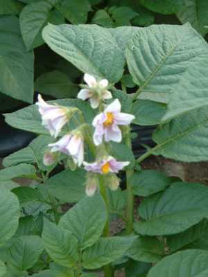 ナス科/多年草 通常の場合、ジャガイモは種芋を植え付け培土し、栽培される。種芋は芋から発芽した芽を中心にして適度な大きさに切り分けたものである。直立する地上茎は50cm~1m程度の高さにまで生長する。葉は奇数羽状複葉。葉の付け根から花茎が長く伸び先端に多数の花をつける。花は星形で黄色い花心と5枚の花弁をもち、色は品種によって異なり赤・白・紫と様々である。