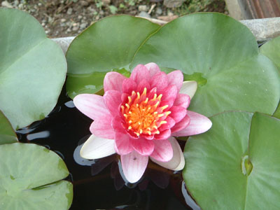 温帯産は水面のすぐ上に花を付けるが、熱帯産は水面から高く突き出た茎の先端に花をつけるそうなので、写真は熱帯産ですね。