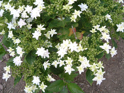 ユキノシタ科/落葉低木/花期:6月~7月頃 梅雨時に咲くガクアジサイ 隅田の花火です。本来は中心部で細かく咲いている所が花だそうです。周りの花びらに見える部分は萼(がく)ということです。その萼の咲き始めは薄緑 そして徐々に白 後半は白にほんのり青みがかかりますがだいたいが白色で咲いています。花の部分は薄緑から徐々に青に変わり たいへん清楚な様子の隅田の花火です。
