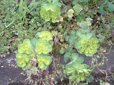 草丈30cm前後、直立し茎の先端が数本に枝分かれします。分枝するまでは互生(ごせい)に葉をつけ、分枝後は5枚の葉を輪生(りんせい)します。葉の縁はギザギザののこぎり状になっています。遠くから黄緑色の花のように見えるのは花を包み込む総苞葉(そうほうよう)で、花びらもがくも消失してしまい雄しべや雌しべがむき出しになっています。燭台に似ることからその名が付きましたが、非常に面白い形態の植物です。