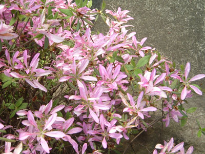 花は、淡紅色で花濃紅色の斑点があります。葉の両面に細かい毛がたくさんあります。花は4~6月頃に咲き、木は1.5m前後になります。モチツツジ(餅躑躅)の園芸種です。