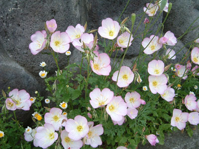 草丈は30-60cmくらい。葉は披針形で互生する。5-7月頃に、4-5cmくらいの大きさの、白または薄いピンク色の花を付ける。花弁の数は4枚で、8本の雄蕊と、先端が十字型をした雌蕊がある。名称の由来は、宵に咲くツキミソウと違って、昼間にも開花していることによる。