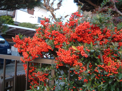 Pyracantha(ピラカンサ)は、ギリシャ語の 「pyro(炎)+ acantha(刺)」が語源。火のような真っ赤な実をつけ、枝にはいっぱいとげがあるところから。これに「ス」がついて「ピラカンサス」。