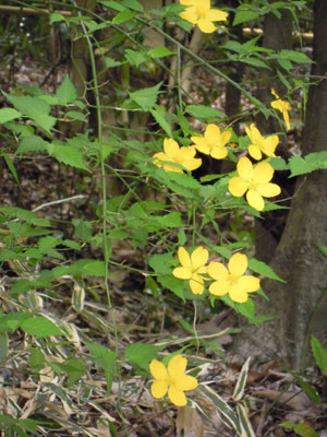 低山の明るい林の木陰などに群生する。樹木ではあるが、茎は細く、柔らかい。背丈は1mから、せいぜい2m、立ち上がるが、先端はやや傾き、往々にして山腹では麓側に垂れる。地下に茎を横に伸ばし、群生する。葉は鋸歯がはっきりしていて、薄い。晩春に明るい黄色の花を多数つける。多数の雄蕊と5~8個の離生心皮がある。心皮は熟して分果になる。一重のものは花弁は5枚。 いちにちさん・・・本当だ。花弁が5枚だ。