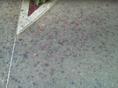 図書館の入り口がぼとぼとと汚れてて、何だろう?と上を見たら。