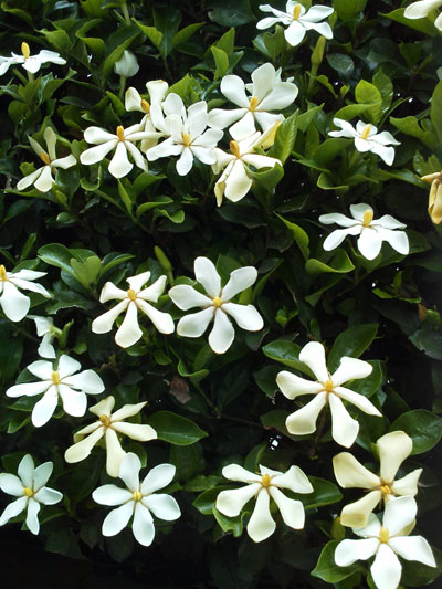 樹高1-3 mほどの低木。葉は対生で、時に三輪生となり、長楕円形、時にやや倒卵形を帯び、長さ5-12 cm、表面に強いつやがある。筒状の托葉をもつ。花期は6-7月で、葉腋から短い柄を出し、一個ずつ花を咲かせる。花弁は基部が筒状で先は大きく6弁に分かれ、開花当初は白色だが、徐々に黄色に変わっていく。花には強い芳香があり、学名の種名「jasminoides」は「ジャスミンのような」という意味がある。