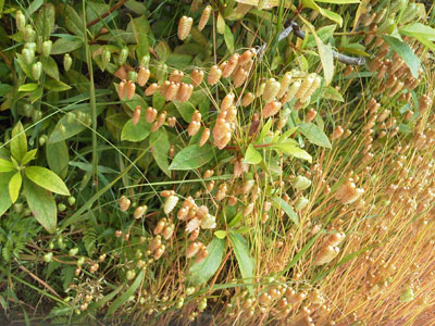 10-11月ごろに赤黄色の果実をつける。果実の先端に萼片のなごりが6本、針状についていることが特徴である。また側面にははっきりした稜が突き出る。