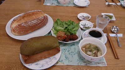 作ったのは豆乳パン、抹茶大納言、アサリときのこのスープ、エビと豆腐のごま揚げです。