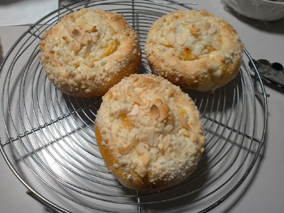 丸く生地をのばして、その上にカスタードクリーム+レモンジャム+クランブル+アーモンドスライスをのせて焼きました。
