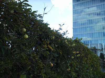 手前の白いのが実。真ん中よりやや右側の楕円形は咲き終わってつぼんだところだと思います。