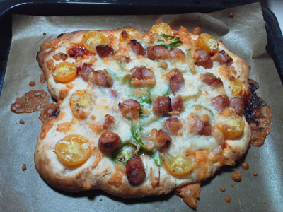 ソーセージ、お隣から頂いたイエロートマト、自家製ピーマン、ツナ、チーズ。