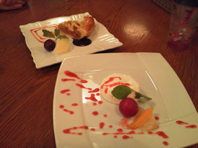 私は手前のレアチーズ、友人はアップルパイでした。丸いのは葡萄でした。