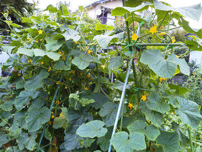 畑にころたん(ミニメロン)、小玉スイカ、ゴーヤのツルがはびこっています。