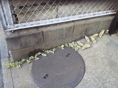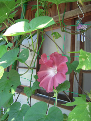 アサガオ(朝顔) 団十郎朝顔は二代目市川團十郎が、歌舞伎十八番の内「暫」で用いた衣装の色が海老茶色であったことにちなんでつけられた名前。 生産量が激減し、今では「幻の朝顔」と言われている。 正式な「団十郎」、つまり、本物は黄蝉葉・斑なしの葉で濃茶色の無地の日輪抜けの花を指す。 蝉葉とは通常葉の耳が左右一つずつなのに対して、左右二つづつある葉でその葉の形状を持つものは大輪の花が咲くらしい。