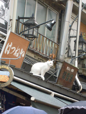 ようやくメインストリート谷中銀座に到着。 両側にたくさんのお店が並びます。 食べ物やさんが多いかな? 何故か屋根には猫のオブジェ。