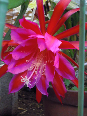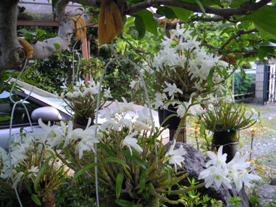 茎は細長く、堅く、始めは緑色を帯び、通常は後に黒紫色になる。多数の節があり、節ごとに出る葉の基部の鞘に包まれる。一年目の茎には節ごとに葉がある。葉は細い楕円形で、厚くやや堅く、つやがある。葉は年の終わりには葉鞘との間で脱落する。新しい芽は古い茎の基部から横に顔を出す。また、茎の先の方から新しい芽が伸び、その根元から根を生じる形で新しい個体ができることもある。大きさが十分であれば、葉のなくなった茎は、次の年に花を咲かせる。花は、茎の先端に近い数節から出る。各節からは、短い花茎が出て、そこから数個の花を咲かせる。花は赤紫がかった白の花弁で、よい香りがする。唇弁以外の五弁は、いずれも同じくらいの大きさの卵状楕円形、先端はややとがる。唇弁は外見は他の花弁と似たような形で、ただし蕊柱との間の奥の方にくぼみが入り込み、短い距を作る。側弁の基部が下側の外でこれにつながっている。