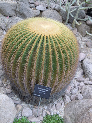 メキシコ中部のケレタロ州が原産です。球状サボテンの代表種で、数十年かけて直径90~180センチほどに成長します。植物体は薄緑色で、成熟するとビヤ樽のようなかたちになります。茎には強固なリブがあり、黄色い棘が生えています。夏、茎の上部に冠状に黄色い花を咲かせます。花が咲くには20~30年かかるそうです。 残念ながら花は咲いていませんでした。