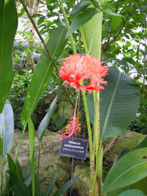 ハイビスカスに似ていますが,5 枚の花弁が反り返り,細く裂けています。雄しべも長く,花が垂れ下がっているところを風鈴に見立てた名称になっています。