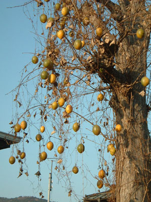 林や藪の草木にからみついて成長する。葉はハート型で表面は短い毛で覆われる。花期は夏で、7月~9月にかけての日没後から開花する。白色で5弁のやや後部に反り返る花弁は、縁部が無数の白く細いひも状になって伸び、直径7~10cm程度の網あるいはレース状に広がる。果実は直径5~7cmの卵型形状で、形状は楕円形や丸いものなど様々。熟する前は縦の線が通った緑色をしており光沢がある。10月から11月末に熟し、オレンジ色ないし朱色になり、つるがからみついた枯れ木の中でポツンと目立つ。