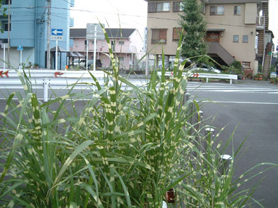葉に淡黄色の横縞がある園芸種ですが、日本全土に分布する。段斑の様子を例えての命名が多い。花期9~10月。ススキは変異が多い。小穂の基部の毛が紫色のものを「紫ススキ」、葉の幅が5mm以下と細いものを「糸ススキ」と呼ぶ。鑑賞用に栽培されているものとして、葉に白い縞のある「縞ススキ」、淡黄色の横縞のある「タカノハススキ」などがある。