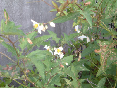 花は白または淡青色で、ナスやジャガイモに似ていて、春から秋まで咲き続けます。果実は球形で黄色く熟したトマトに似てるけど、全草がソラニンを含み有毒なので、英語でも"Apple of Sodom"(ソドムのリンゴ)、"Devil's tomato" (悪魔のトマト)などという悪名でも呼ばれているのだとか。