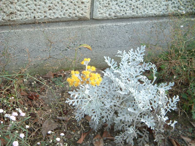 キク科/多年草/別名:ダスティーミラー 葉と茎は白い綿毛でおおわれているのが特徴。6月頃、その先端に黄色の花をつける。