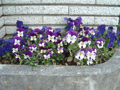 パンジーは交配が進み、黄金色、オレンジ色、紫色、スミレ色、黒(濃青による)など多彩な色彩をもっている。わずかに重なった2枚の上側の花弁、2枚の脇の花弁、下側3枚の花弁が結合するヒゲ、およびわずかな切れ込みを持つ1枚の下側の花弁からなる。