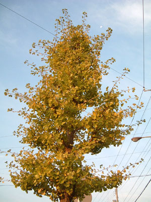 イチョウ科/原産:中国/落葉高木 葉は扇形で葉脈が付け根から先端まで伸びている。また、葉の中央部が浅く割れている。 雌雄異株であるため、雄株と雌株があり、実は雌株にのみなる。雌雄の区別は葉の形でできるという俗説もあるが、植物学的には根拠がない。花期は4~5月。雌花、雄花とも葉が芽吹くと共に出てくる。実がなるには雄株の花粉による受粉が必要である。花粉は1km程度離れた雄株からでも飛散してくるという。