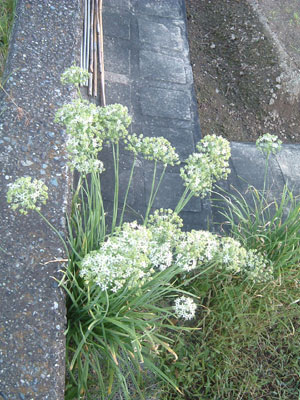 夏には葉の間から30-40cmほどの花茎を伸ばす。花期は8-10月頃。花は半球形の散形花序で白い小さな花を20-40個もつける。花弁は3枚だが苞が3枚あり、花弁が6枚あるように見える。雄しべは6本、子房は3室になっている。子房は熟するとわれて黒色の小さな種を散布する。