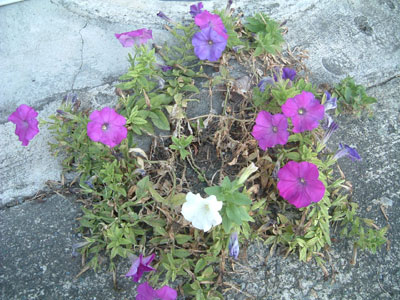 花は直径3~4センチ程度で花弁は5裂し、色は白、ピンク、赤、赤紫などがあり中心だけ色が違うものもある。初夏から晩秋まで次々に咲くので「日々草」という。葉は長楕円形で対生する。 いろんな色で長い間楽しませてくれた花です。