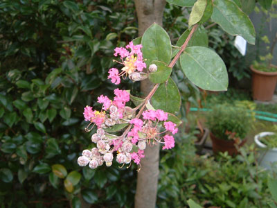 「約100日間、ピンクの花を咲かせる。」のが名前の由来。約3ヶ月間、秋まで咲き続ける。 実際には、一度咲いた枝先から再度芽が出てきて花をつけるため、咲き続けているように見える。 ”幹がスベスベで、猿も登れない”ところから「猿滑」とも書く。
