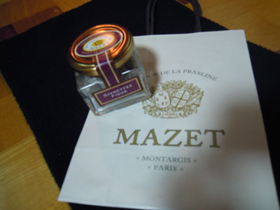マゼさんのイチジクを練り込んだダークチョコでキャラメリゼしたアーモンドを包み、アイシングシュガーで仕上げた一品。