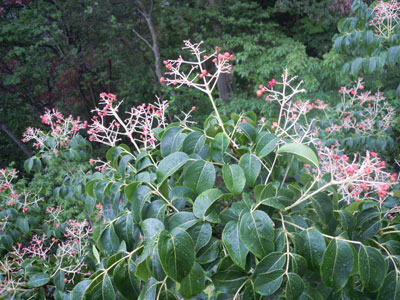 枝は紫黒色をし、羽状複葉をつける。初夏、黄緑色の小花が多数つく。実は赤く、熟すと裂けて黒い種子が見える。