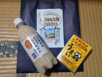 お帰りにひとめぼれ(ペットボトルに入った生米)とティッシュをもらいました。