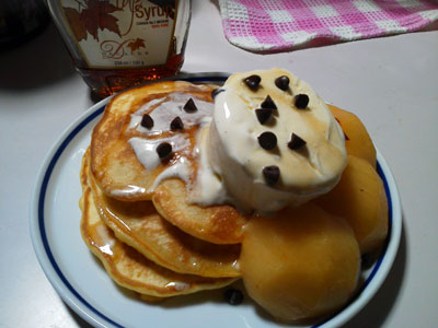 メイプルシロップと、カップアイスと、チョコチップを載せて。