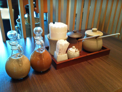 右の小さな瓶には、「甘口」と「辛口」のソースが入っています。