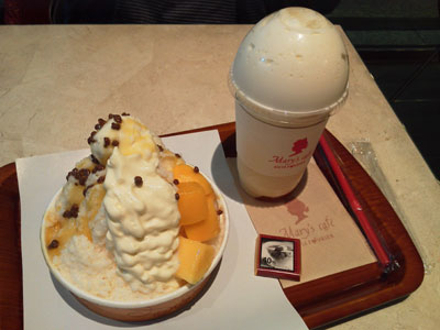 この写真は7月の終わりでまだ暑かったので、マンゴーのかき氷とドリンクを友達とシェアしました。