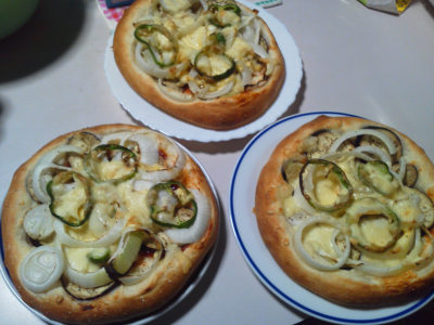 自家製玉葱と、ピーマンを使って、ピザを焼きました。
