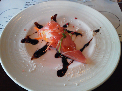 次に出されたのは、桃+ネギと生姜の細切り+生ハム!