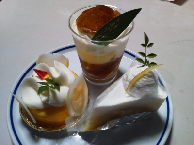 左の丸いケーキの3方を薄い花びらのように囲まれていますが、この白いのはホワイトチョコでした。