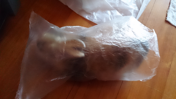 ココアは、好奇心旺盛でついでに食欲も旺盛。餌の入っているナイロン袋に頭から突っ込んで、むしゃむしゃやっちゃいます。(^_^;)
