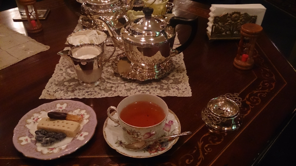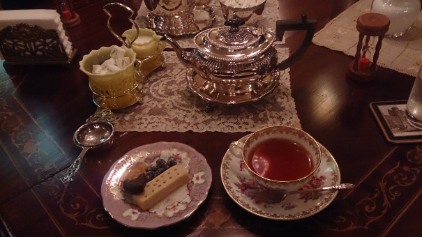 出していただいた食器も、年代物で。紅茶のポットも自分たちで選ばせてくれるのですが、自分のは百年、友人のポットは180年ほど前の銀のポットでした。座った椅子も一脚35万円でしたし…何気に踏みつけている絨毯は130万円でした…。